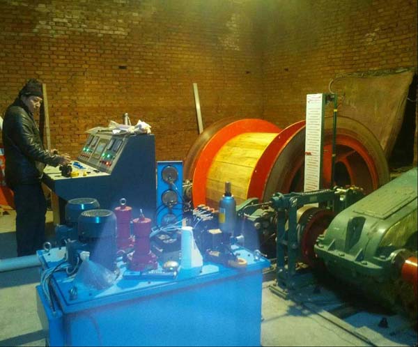 2、電機上下定子及轉子吊裝,用20T的吊車移到提升孔的位置;在吊裝到南門時,在主井井塔的提升孔的位置,把起重機鉤頭和吊車同時掛上吊點,一拉一松同步進行,使其停放在提升孔的位置;然后用起重機起吊,注意繩頭和包裝箱接觸的地方要用木板墊好,防止受力時損壞包裝箱進而損壞設備。JTPB-1.6×1.2防爆提升絞車導向輪的吊裝,等吊到第十三層時用5T千不拉配合起重機把導向輪牽引到六層井塔內,再用扒桿移動到合適位置即可。