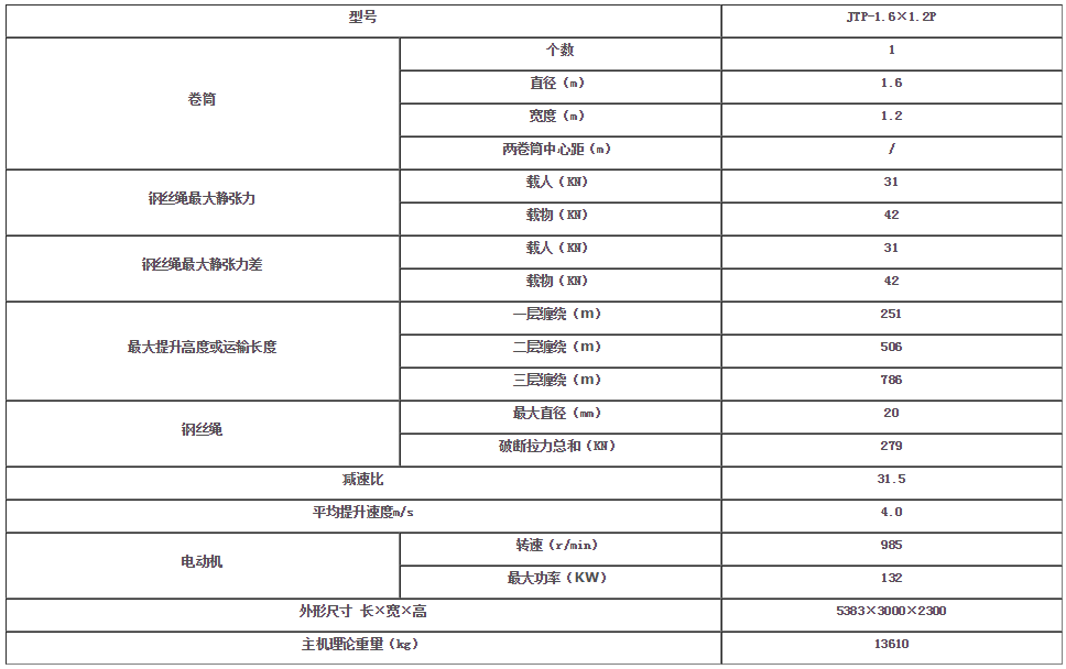 JTP-1.6x1.2P米礦用提升絞車技術(shù)參數(shù):